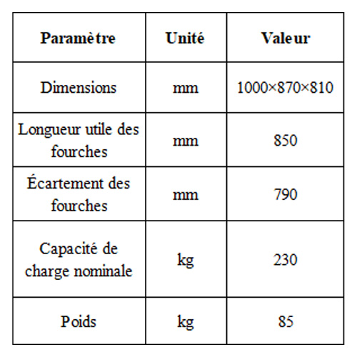 Espacement réglable : L’espacement des fourches est conçu pour être flexible, permettant un réglage rapide et facile afin d’accommoder des palettes et matériaux de différentes tailles. Cela garantit une compatibilité maximale et une grande flexibilité opérationnelle, améliorant ainsi l’efficacité du travail.